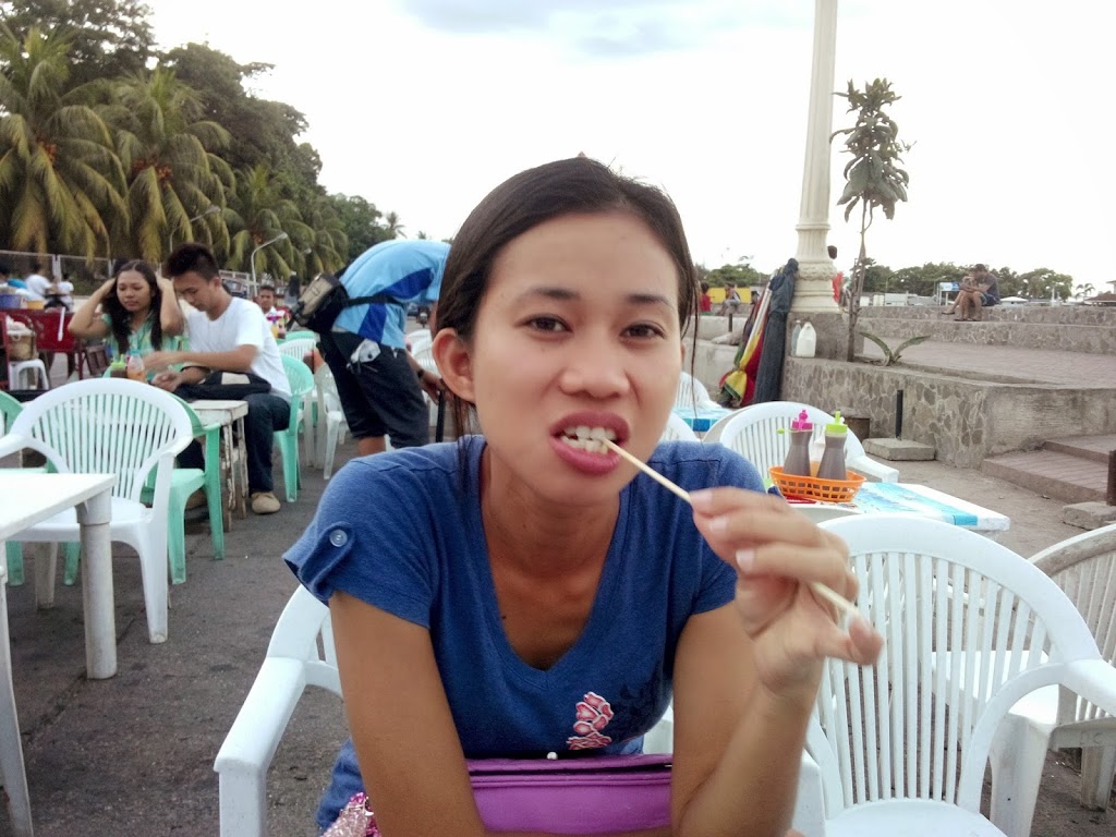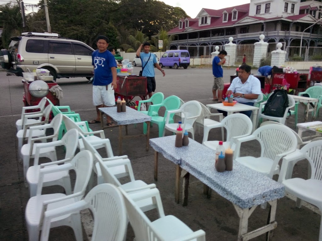 Lined up along the northern edge of Dumaguete’s Rizal Boulevard is a section of rather small plastic tables and chairs. This diminutive dining area is catered to by a number of locals serving up fried tempura and balut (crunchy, fertilized duck eggs complete with small bones and feathers). The other day, Michell and I decided to head down and sample some of the local fare (sans bloody duck eggs). The first thing you notice is that the chairs are VERY small. I am not a big guy – 5 foot 10 and a bit under 200 lbs – but you soon realize that these seats were not designed for larger folk of the Caucasian persuasion. Come to think of it, I have never seen a foreigner eating there. I am sure they do or have, I just haven’t seen it.